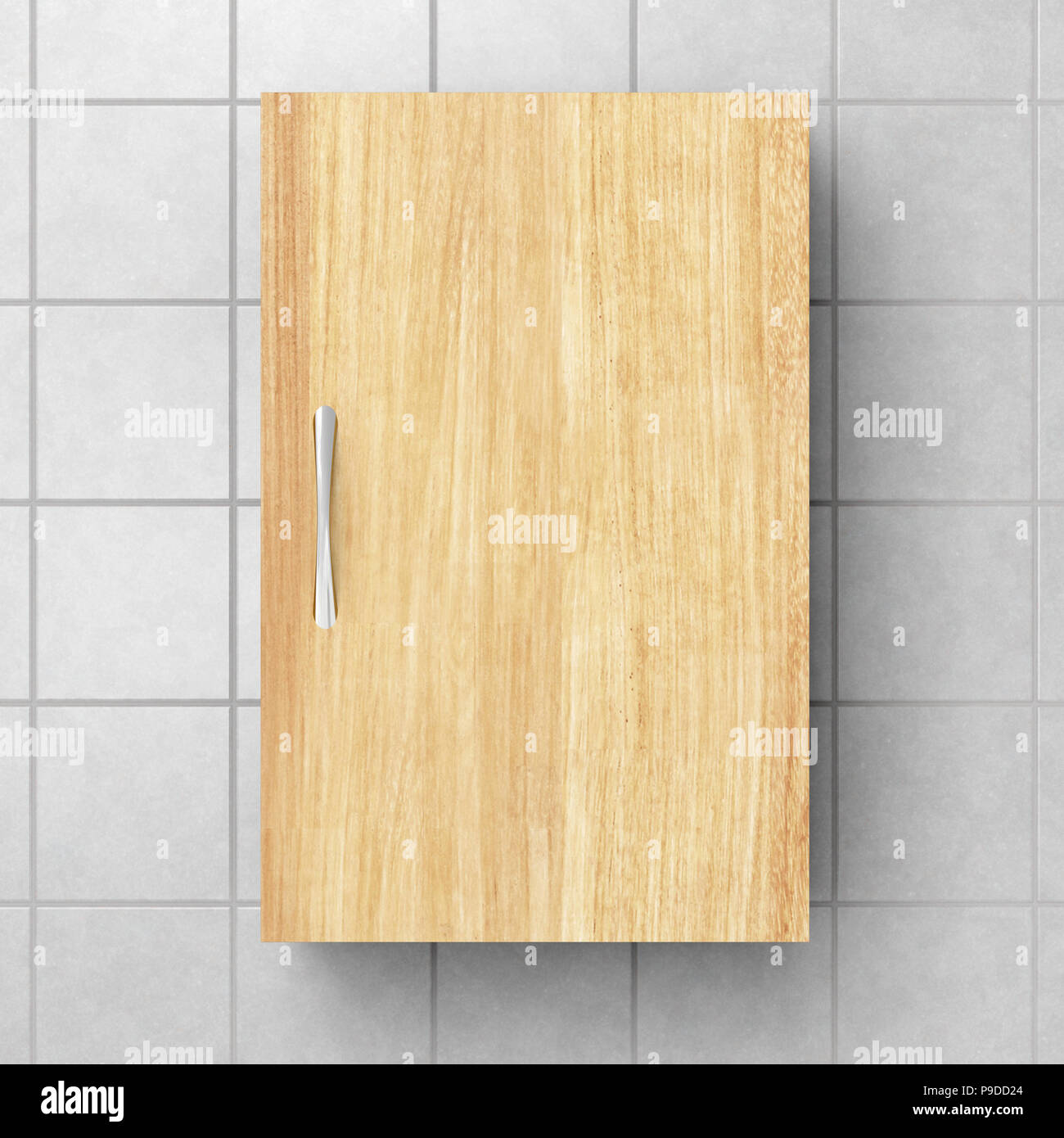 Closed Wooden Bathroom Cabinet Isolated On White Tiled Wall With
