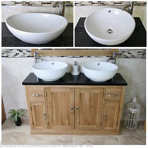 Solid Oak Bathroom Vanity Unit Cabinet Twin Ceramic Bowl Basin Tap