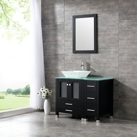 24 Wood Bathroom Vanity Cabinet Tempered Glass Countertop