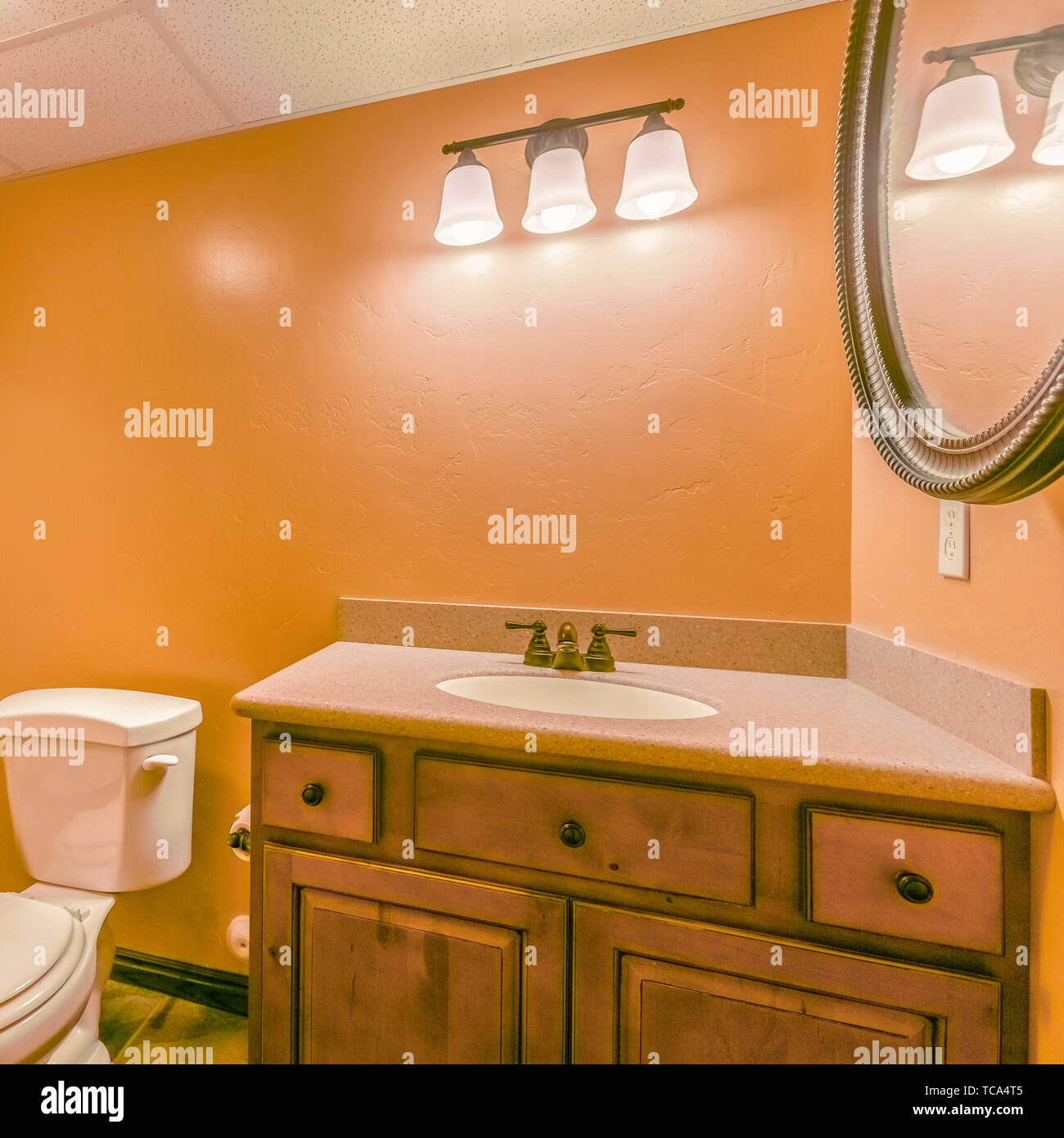 Square Toilet And Vanity With Wooden Cabinet And Round Mirror