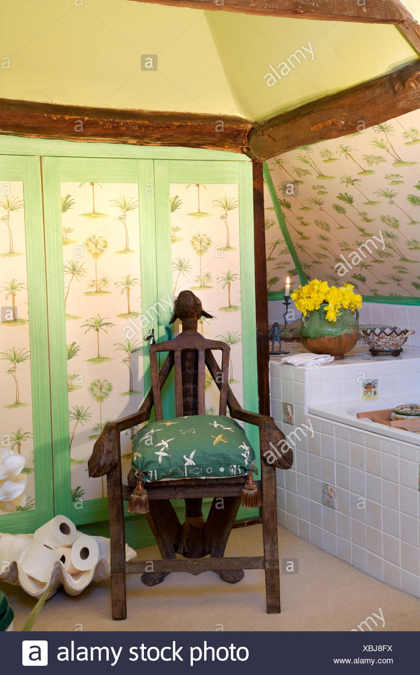 Unusual Wooden Chair Beside Bath In Yellow Country Bathroom With
