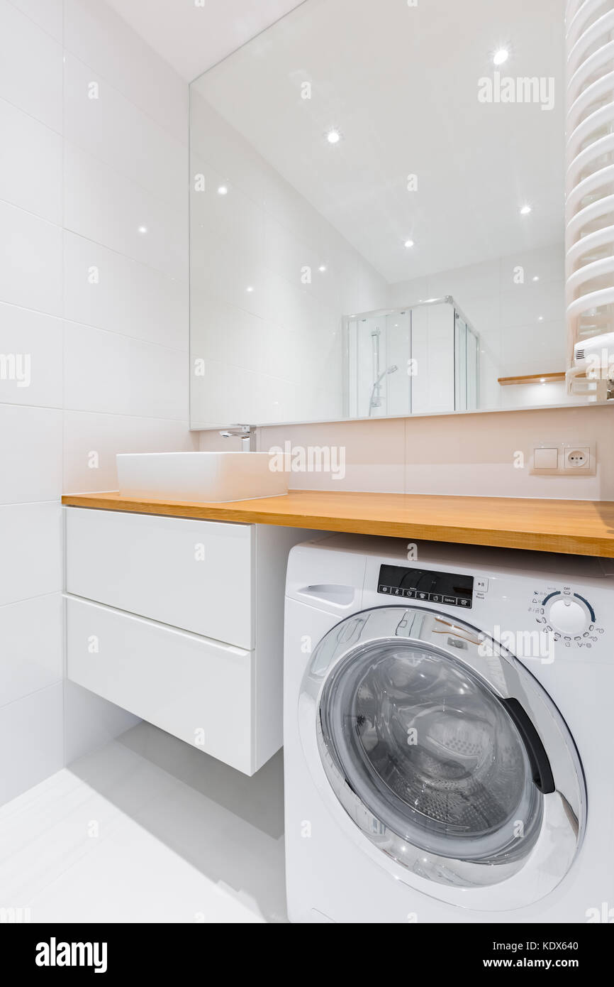White Bathroom With Wooden Countertop Basin Cabinet Mirror And