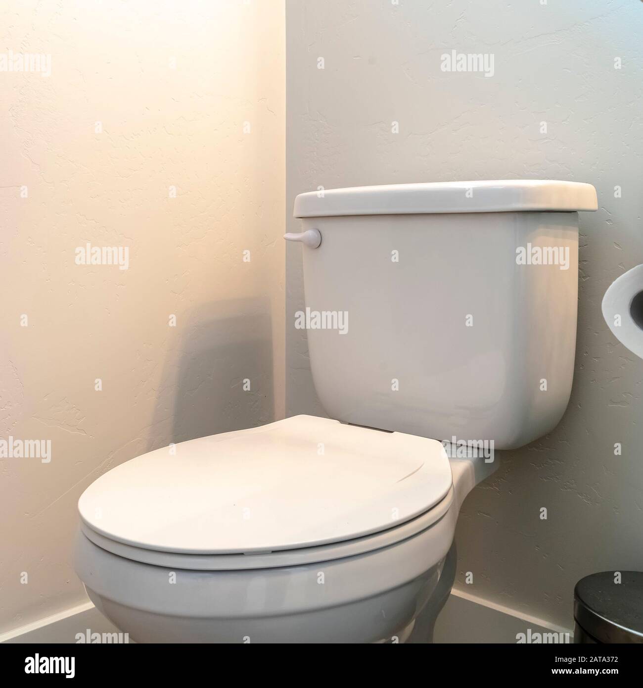 Toilet Beside A Trash Can And Bathroom Cabinet With Tissue Roll